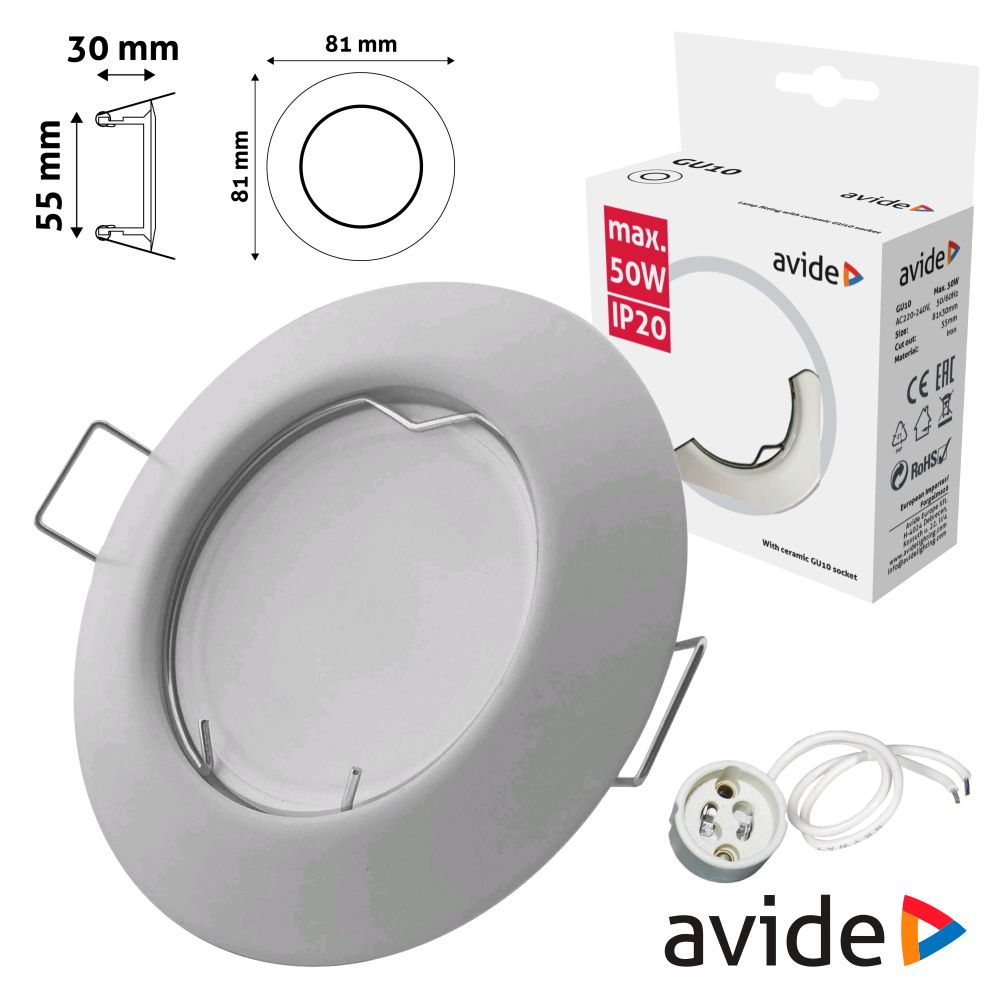 - Aro redondo p/ montar lâmpadas no tecto - Estrutura robusta em liga de Zinco branco - Adequado p/ lâmpadas GU10 e MR16 - Fixação c/ molas laterais, cónico, IP20 - Diâmetro: Ø81cm, furo: Ø55mm - Inclui casquilho GU10, capacidade: até 50W
