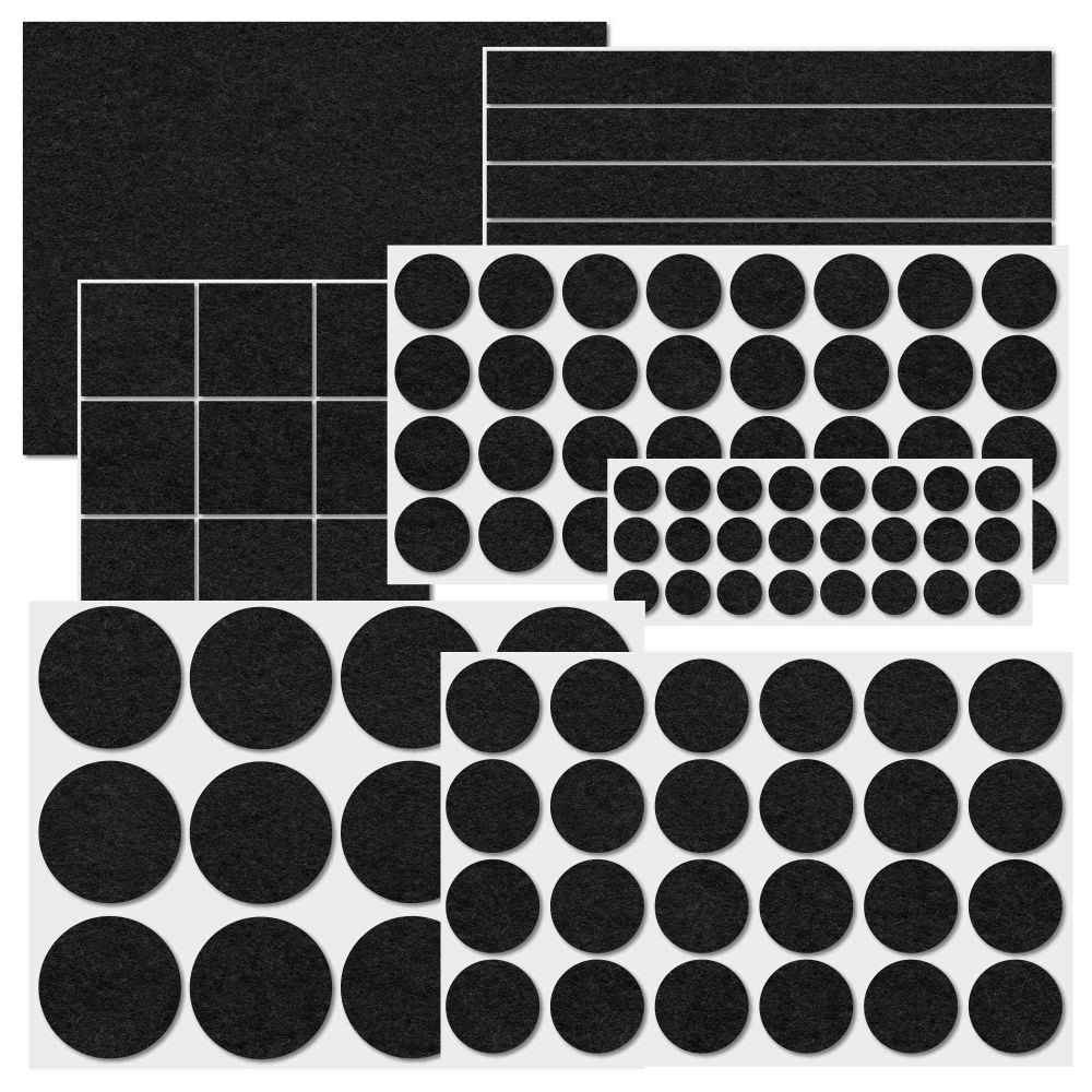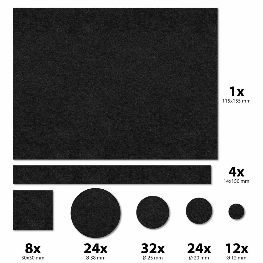 - Conjunto de 106 autocolantes feltro diversos - Adequado p/ proteger as superfícies - Material: 100% poliéster - Inclui 24x Ø12mm, 32x Ø20mm, 24x Ø25mm, 12x Ø38mm, 1x 11,5x15,5 cm, 4x 1,4x15cm e 9x 30x30mm