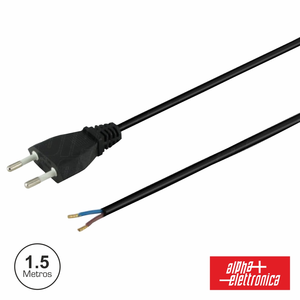- Cabo alimentação c/ ficha plana macho - Capacidade máxima: 2,5A@250V - Estrutura em PVC Preto - Diâmetro condutores: 2x Ø0,75mm?2; - Comprimento cabo: 1,5 Metros