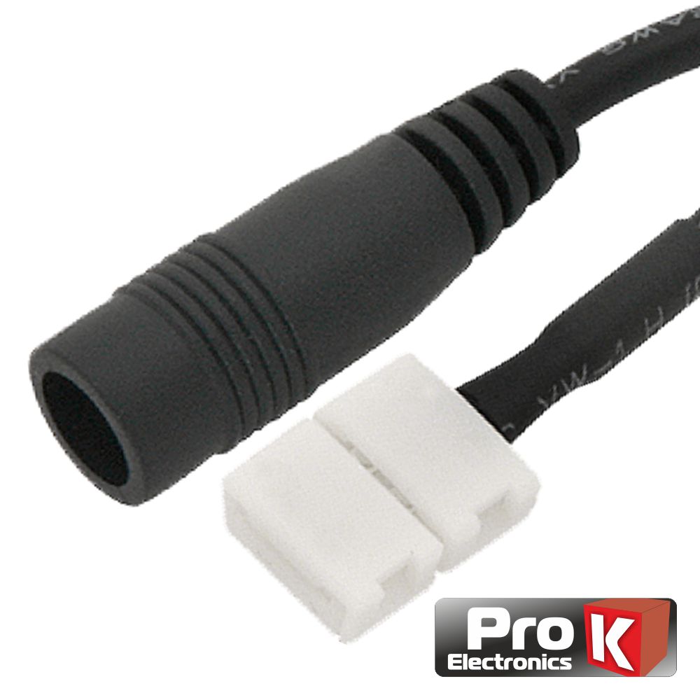 - União p/ fitas de LEDs monocor - Cabo alimentação DC Fêmea - Dimensões da ficha: Ø5,5x2,5mm - Conector c/ 2 Pinos, largura: 8mm - Não necessita de soldadura - Adequado p/ fitas de LED monocor