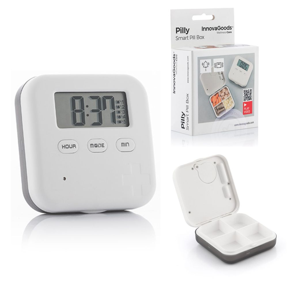- Útil p/ guardar medicamentos e relembrar tempos de posologia, c/ até 5 alarmes diários - 3 funções: relógio, alarme e cronómetro - Alarme sonoro e de vibração - 4 Compartimentos p/ comprimidos - Alimentação: 1x pilha CR2032 (inc.) - Dimensões: 65x20x65 mm