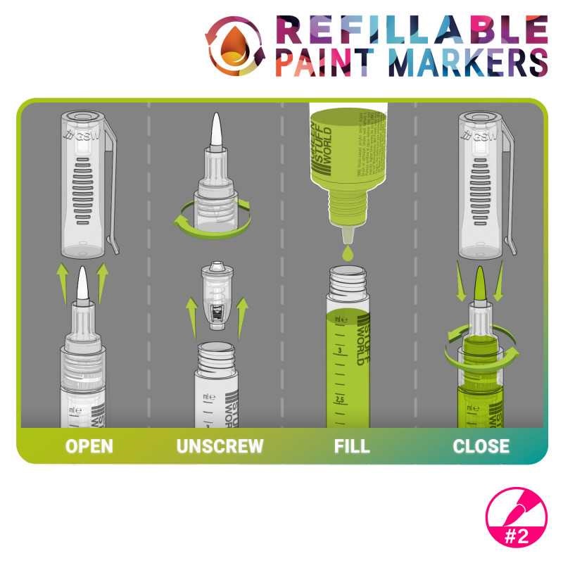 Os marcadores recarregáveis da Green Stuff World oferecem uma solução inovadora e altamente prática para a aplicação de diferentes tipos de tinta em miniaturas, bem como em projetos de modelismo, arte e trabalhos manuais. As suas pontas finas em feltro são compatíveis com uma ampla variedade de produtos, incluindo tintas de modelismo, tintas metálicas, tintas alcoólicas, tintas cromadas e até tintas a óleo, tornando-os uma ferramenta versátil para pintores de miniaturas, artistas de banda desenhada e ilustradores.