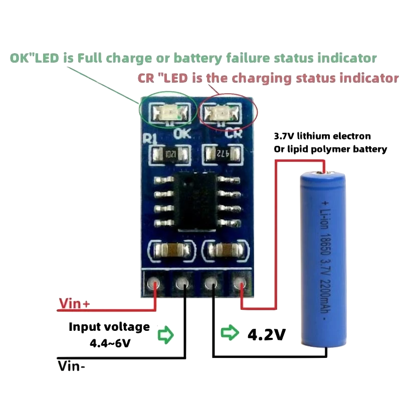 Tensão de alimentação DC 4.4-6V, tensão de saída DC 4.2V;