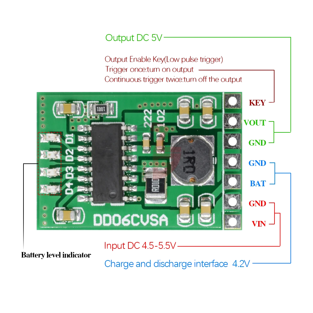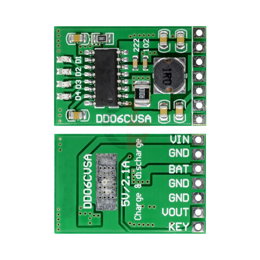 Tensão de carga: dc 4.5v-5.2v (se a fonte de alimentação é 5.2v-5.5v, por favor diodos paralelos (por exemplo ss34 smb)) Corrente de carregamento: 0-2.1A Corrente quiescente da carga: 100ua Tensão de carga completa: 4.2v +-1%. Corrente de descarga: 0-3.5a; Corrente quiescente da descarga: 50ua Eficiência da conversão da descarga: máximo 96% Tensão de saída: 5v Corrente de saída: 0-2.1a; Temperatura ambiente de funcionamento: -20 ° a + 85 ° Tamanho: 26.7x18.1x5.7mm