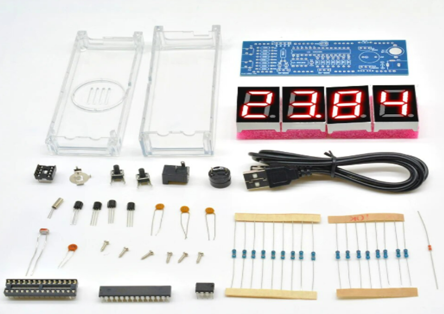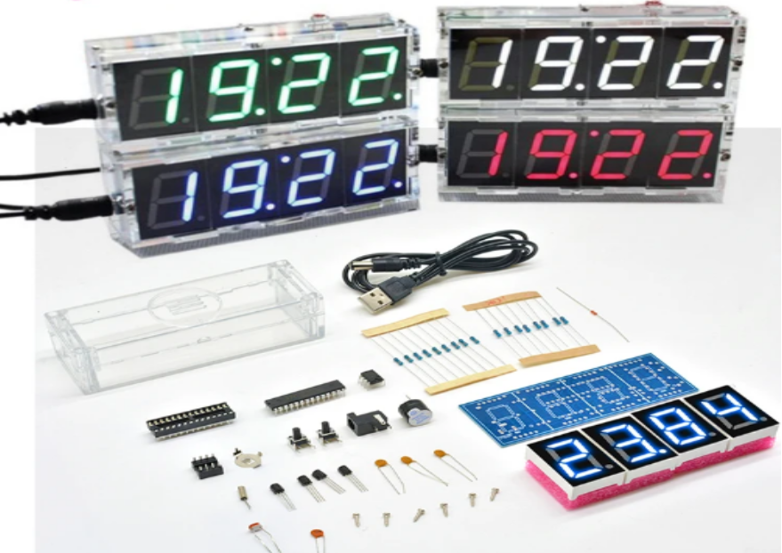 Um kit DIY relógio digital ideal para entusiastas de eletrónica. Exibição automática de hora, temperatura e data. Com controle de luz, o relógio será automaticamente mais brilhante durante o dia do que à noite. Suporta um grande display LED de 4 dígitos. Função do alarme e a função do temporizador.