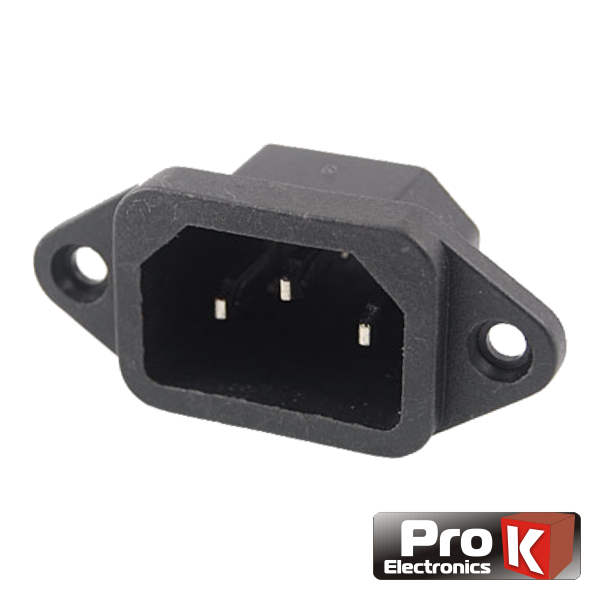 - Ficha de alimentação IEC 3P Macho C14 - Estrutura em termoplástico Preto - Ficha reforçada c/ fibra de vidro - Tensão máxima: 250V / 10A - Contactos em liga de cobre - Conector de painel c/ faston 6,3mm