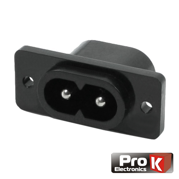 - Ficha de alimentação tipo-8 (C8) - Estrutura em termoplástico Preto - Ficha reforçada c/ fibra de vidro - Tensão máxima: 250V / 2,5A - Contactos em liga de cobre - Conector de painel