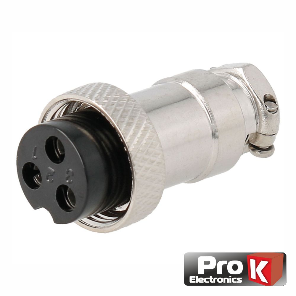 - Ficha de Microfone Fêmea 3P - Estrutura Niquelada - Isolamento em resina Fenólica - Terminais de soldar - Adequado p/ cabo: Ø5-7mm - Fixação por Serra-Cabos