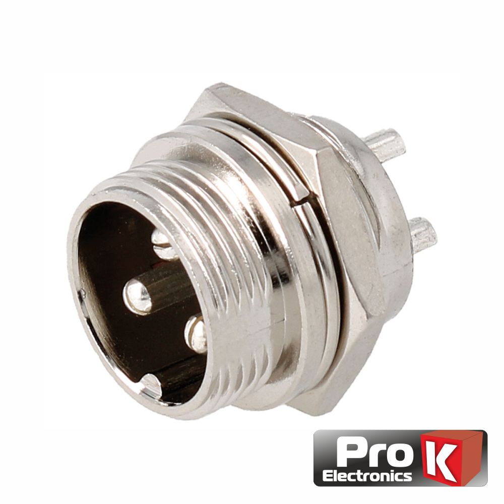 - Ficha de Microfone de Painel - Tipo: Macho 3 Pinos - Estrutura Niquelada - Isolamento em resina Fenólica - Terminais de soldar