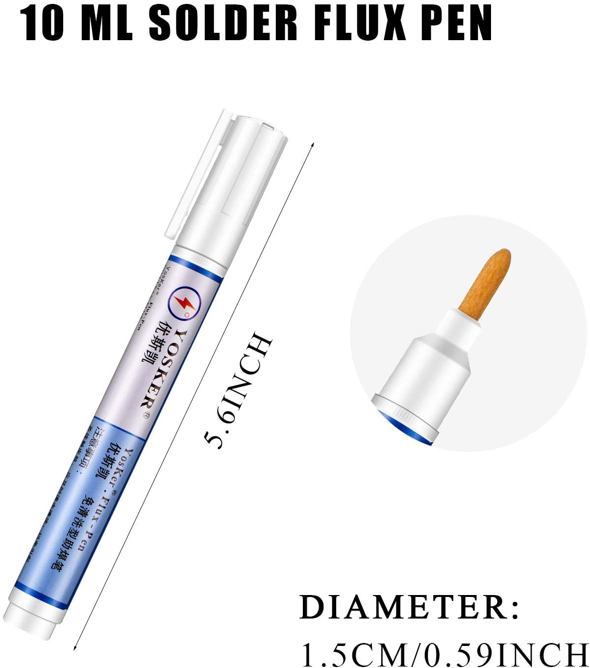 Caneta de fluxo de solda branca com rótulo azul e ponta amarela de espuma