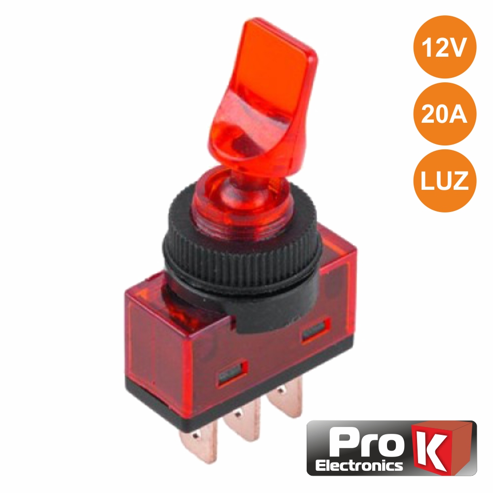 - Interruptor alavanca vermelho c/ luz - Tipo de contacto: SPST ON-OFF - Estrutura Plástico vermeha transparente - Tensão: 12V, capacidade: 20A - Número pólos: 1, terminais: 3 - Montagem em painel