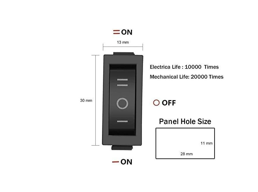 - Interruptor Basculante ON-OFF-ON - Tipo de Contacto: SPST - Voltagem: 250V/15A - 125V/20A - Nº Terminais: 3 - Montagem em Painel para Encastre - Furação para montagem: 30,3 x 10,6mm