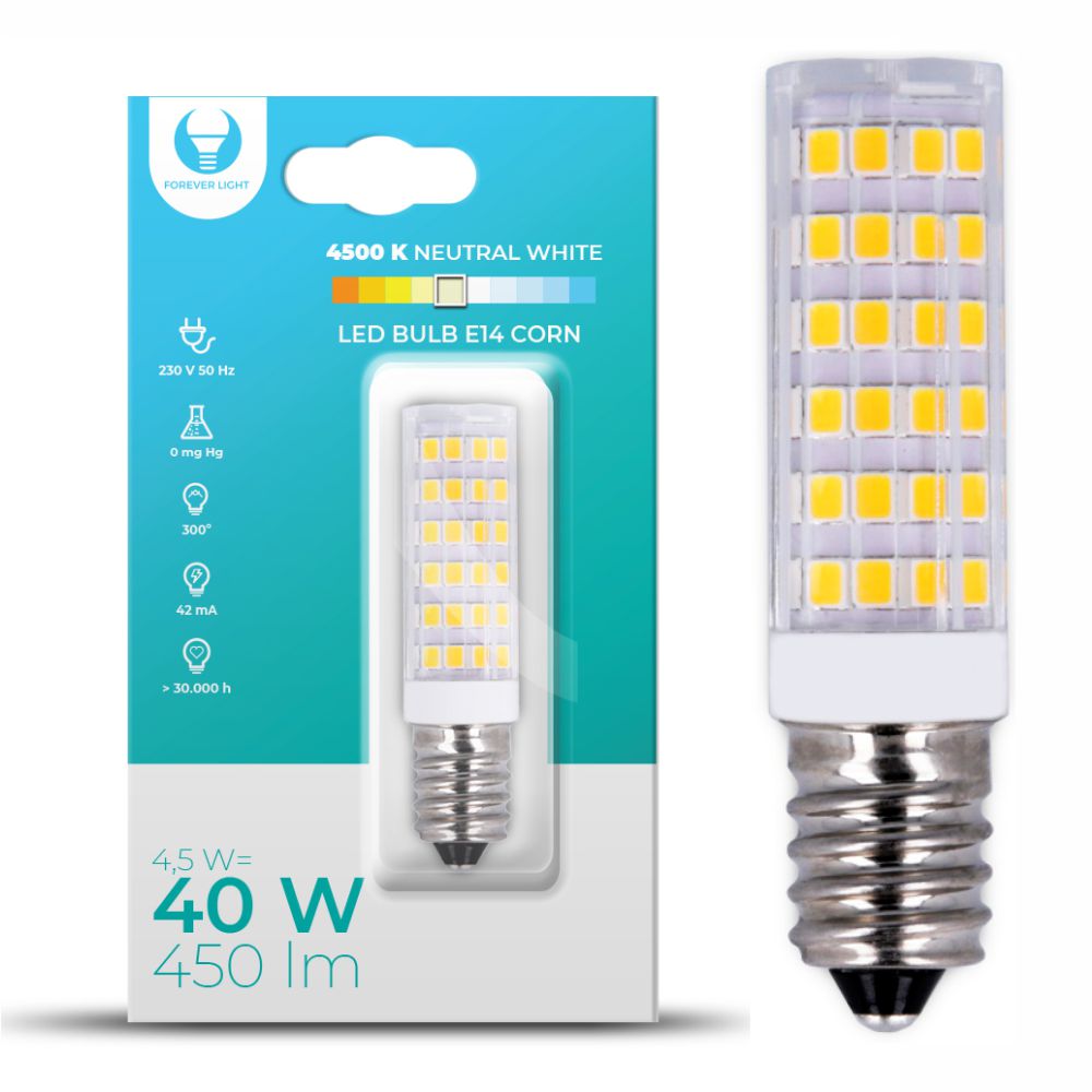 - Lâmpada E14 LED Corn - Tipo de Casquilho: E14 - Tensão funcionamento: 230VAC - Potência: 4,5W=40W, Branco Natural - Temperatura cor: 4500K, 450 Lumens - Ângulo: 300º, Tempo de vida: 30000h