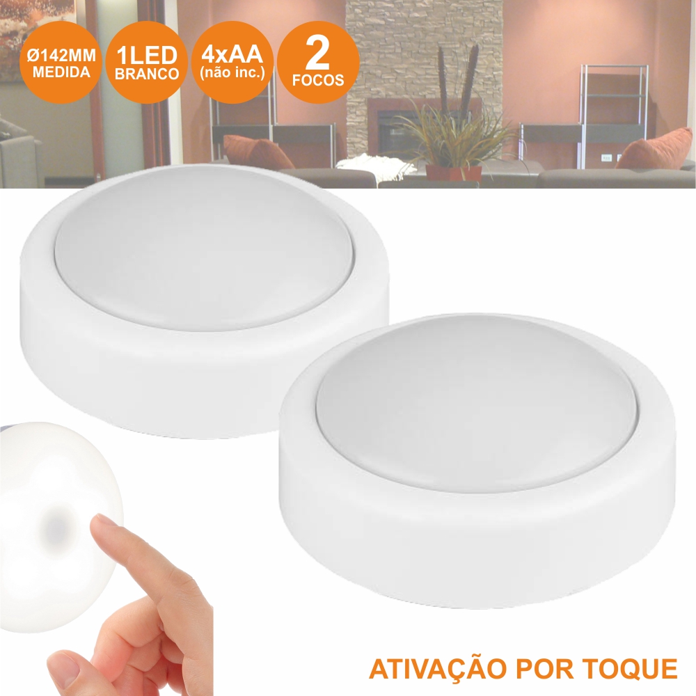 - Painéis LED redondo aplique - Equipado c/ 1 LED Branco (cada) - Estrutura em Plástico Branca - Alimentação: 4x AA (não inc,) - Ativação por toque, 2 unidades - Peso: 0,29 kg - Dimensões: 142x142x28 mm