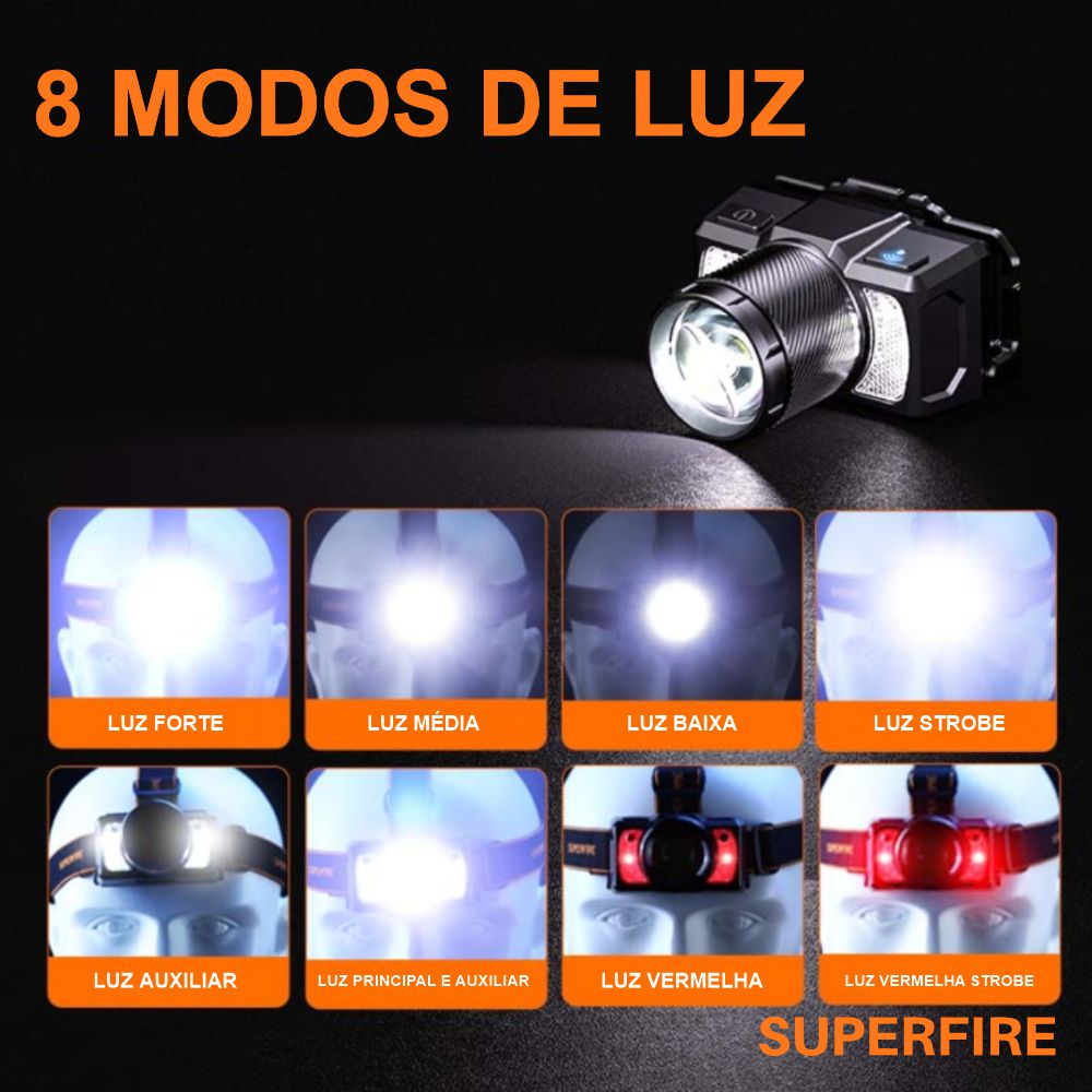- 8 modos (luz forte, luz média, luz baixa, strobe, luz auxiliar, luz principal e auxiliar, luz vermelha, luz strobe vermelha)