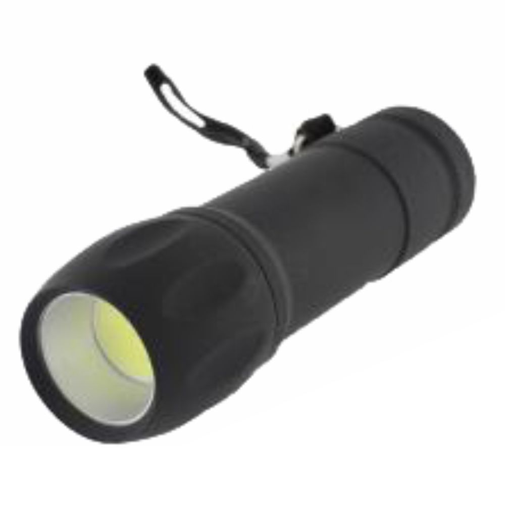 - Lanterna alumínio compacta - Equipada c/ 1 LED COB Branco 3W - Autonomia máxima: até 8h - Intensidade luminosa: 100 Lumens - Alimentação: 3x Pilhas AAA (não inc.) - Estrutura em ABS preta compacta - Dimensões: 25x28x97 mm