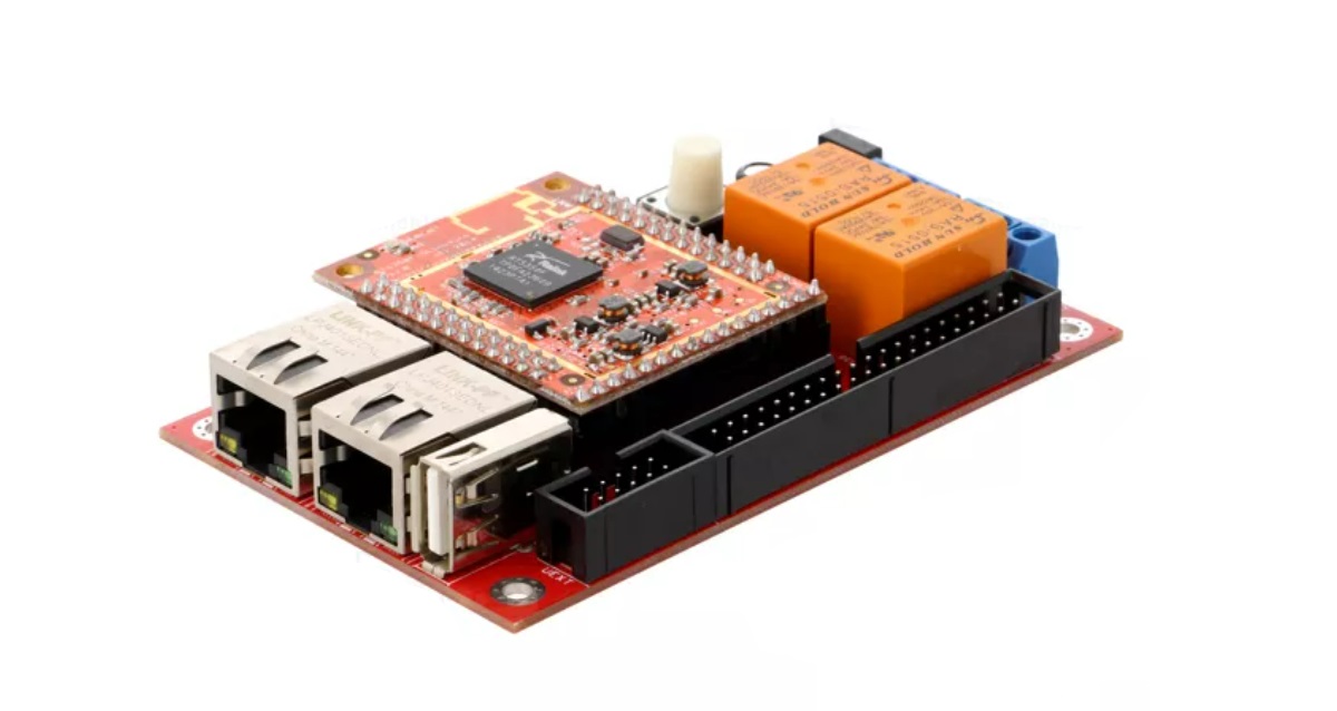 O RT5350F-OLinuXino-EVB é um computador de placa única de hardware aberto desenvolvido pela Olimex. Equipado com o SoC RT5350F da Ralink, possui um núcleo de CPU MIPS24KEc a 360 MHz, 32 MB de SDRAM e 8 MB de memória Flash SPI NAND. A placa oferece conectividade Wi-Fi de 2,4 GHz compatível com 802.11n até 150 Mbps, duas portas Ethernet de 10/100 Mbps, dois relés de 10A/250VAC (15A/120VAC 15A/24VDC) com conectores e LEDs de status, um botão programável pelo usuário, conector USB 2.0 tipo A, conector microSD, conector UEXT e pinos JTAG expostos para programação em cadeia. Além disso, possui três conversores de energia DCDC externos. A placa é adequada para aplicações embarcadas e opera em temperaturas de -10°C a +55°C, com dimensões de aproximadamente 102 x 64 mm