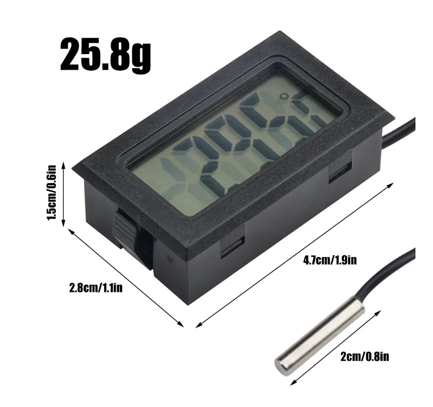 Temperatura gama: -50 ~ 110 ° C Temperatura exibir resolução: 0.1 °C Temperatura medição precisão: 1 °C Cabo 1 metro Tamanho: 47 28 * * 14mm Peso: 22G Alimentação: 2 x bateria botão LR44 (baterias não incluídas)